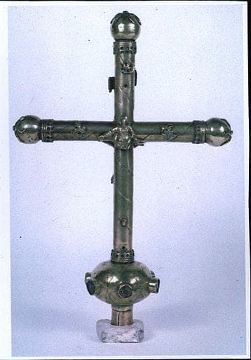 Cabochons d'éamil peint sur le noeud. Christ en croix et INRI à l'avers, Vierge à demi-corps au revers de la croisée. Symboles des quatre évangéliste au revers des bras de la croix.