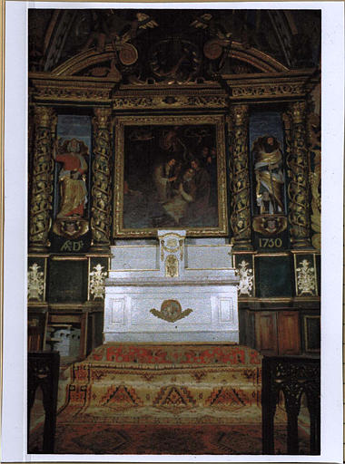A D 1730 concerne plutôt la redorure ; inscription sur le tableau : HAC ME VESTE CONTEXIT sur le phylactère du Christ ; O VIRUM INEFABILEM sur le phylactère ange de droite : antienne des vêpres de saint Martin, le 11 novembre ; PALMAM MARTIRII NON AMISIT sur le phylactère de l'ange de gauche.