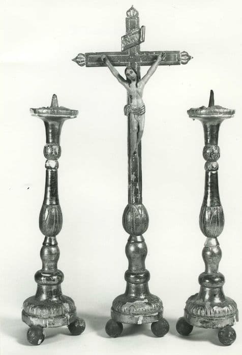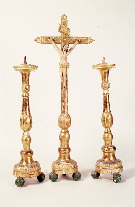 garniture d'autel : 2 chandeliers d'autel ; croix d'autel