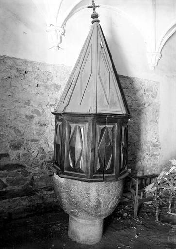 POP | Plateforme ouverte du patrimoinefonts baptismaux (cuve baptismale à infusion) ; couvercle des fonts baptismaux ; réserve à eau baptismale ; vase pour l'administration du baptême (louche baptismale)