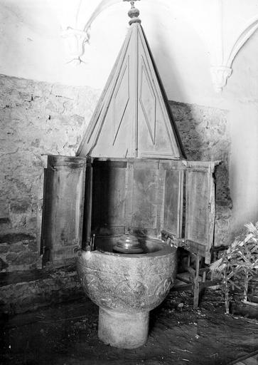 fonts baptismaux ; couvercle des fonts baptismaux ; réserve à eau baptismale ; vase pour l'administration du baptême