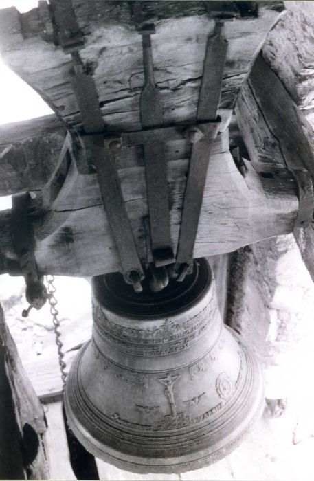 Cloche en bronze, baudrier en cuir, battant en fer forgé ; mouton en bois avec ferrements métalliques. Six anses en couronne. Décor : Christ en croix sur trois gradins encadré de deux angelots, Vierge debout, couronnée et nimbée, évêque abrité par un fronton courbe porté par deux cariatides engainées ; frise de palmettes et de quintefeuilles sur le vase supérieur, frise de palmettes sur la faussure, frise de palmettes et de fleurons stylisés sur le bord.