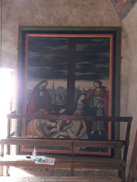 Le Christ est appuyé contre les genoux de la Vierge assise, avec à ses pieds Marie-Madeleine se prosternant et saint Jean debout, les mains jointes, se tenant derrière elle. A droite, debout, sainte Lucie. Fond de ville et de paysage.