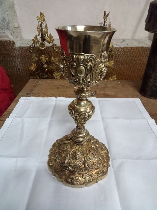 Fausse coupe : angelots, cartouche, pampre de vigne. Sur la terrasse du pied : trois médaillons : la Vierge, saint Joseph, le Christ.