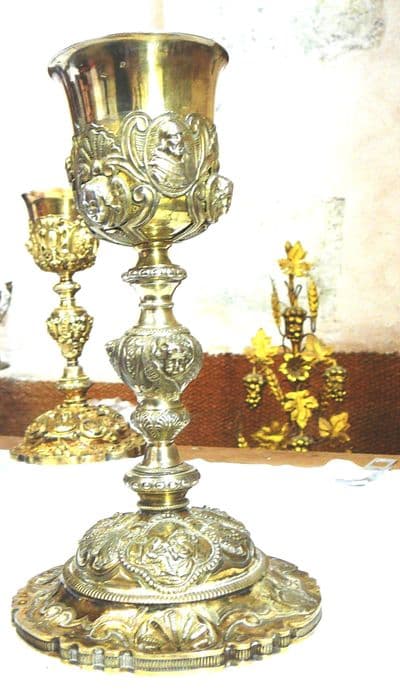 Sur la fausse coupe : Christ, Vierge, saint Joseph. En alternance avec angelots. Sur le noeud : têtes d'angelots. Sur le pied : Adoration des bergers, Pieta, Calvaire.