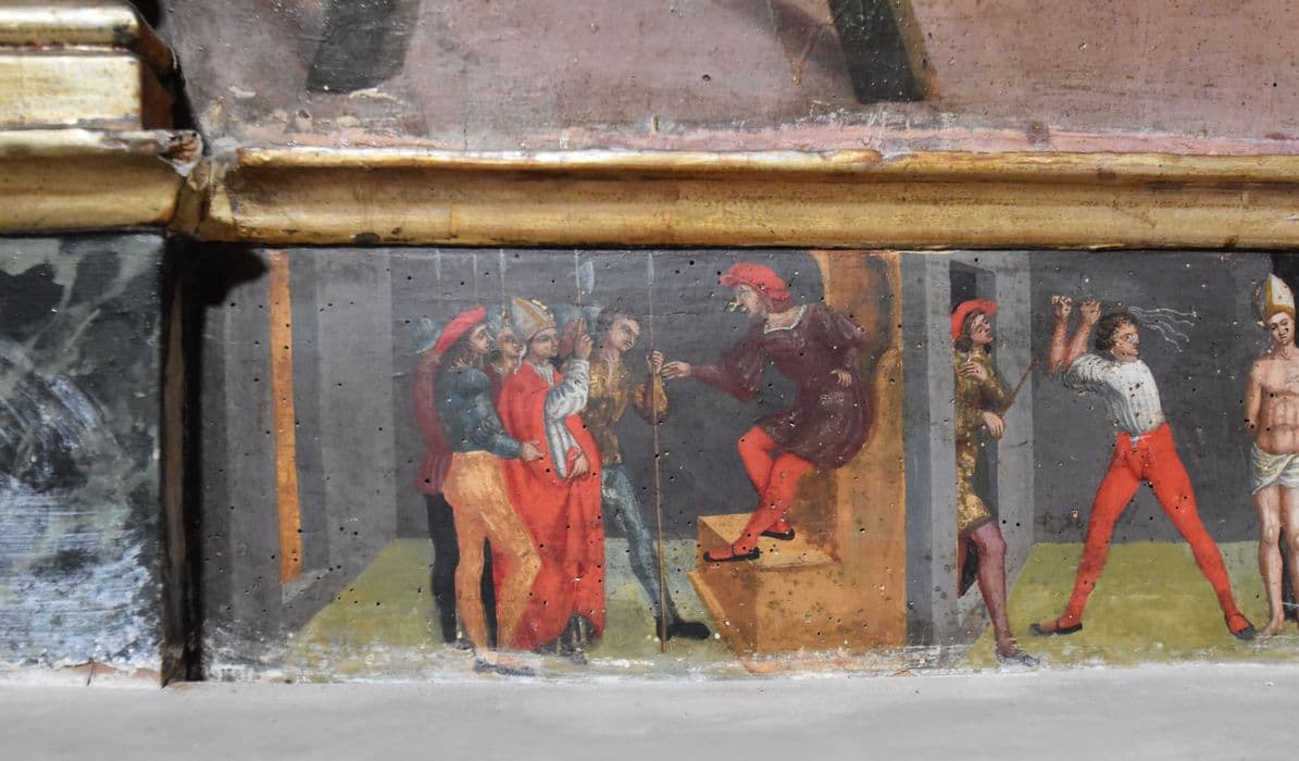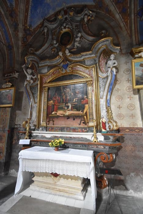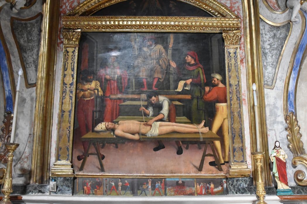 Retable de saint Erasme. Le classement droit comprendre : le retable de l'école de Bréa, d'un réalisme saisissant ; le mobilier : l'encadrement en stuc du 18e siècle, huit chandeliers en bois sculpté et doré du 18e siècle et les canons d'autel en bois doré du 17e siècle.