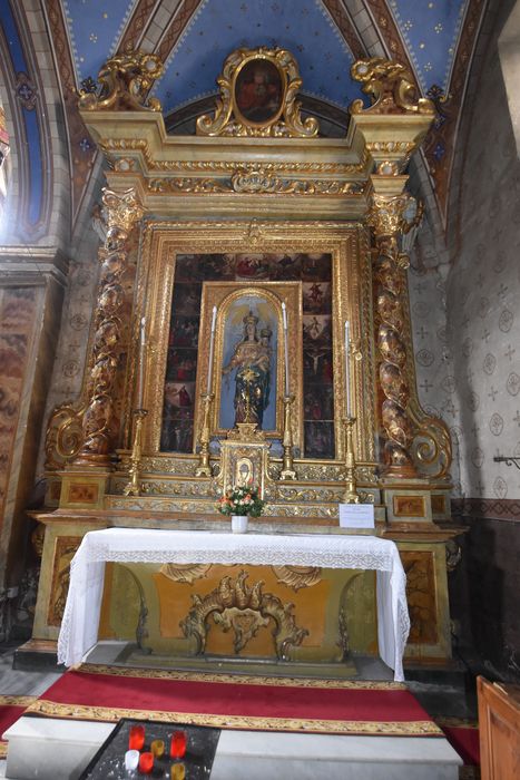 Autel du Rosaire et son retable, toile peinte. Le classement doit comprendre : le retable en bois sculpté polychrome et l'entablement en stuc, 18e siècle ; la table d'autel en stuc du 18e siècle ; les Mystères du Rosaire, toile du 18e siècle ; le mobilier : six chandelier en bois sculpté et doré du 18e siècle, un crucifix d'autel du 17e siècle et les canons d'autel.