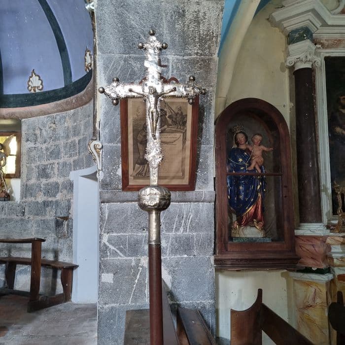 Croix ornée de boules. Face : Christ en croix, avec les attributs des évangélistes aux branches et aux pieds du Christ. Revers : Vierge de face joignant les mains, robe collante, dessinant les formes du corps. Les pierres qui la décoraient autrefois ont disparu.
