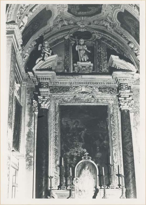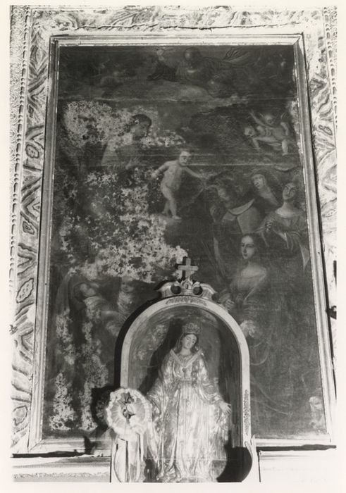 Autel et retable de la chapelle de la Vierge médiatrice, au fronton, statue de l'enfant Jésus portant sa croix, gypseries et bois, 17e siècle, sa toile, Vierge à l'enfant entourée de saints, 17e siècle, et décor de la chapelle, gypseries et cartouches peints, 17e siècle.