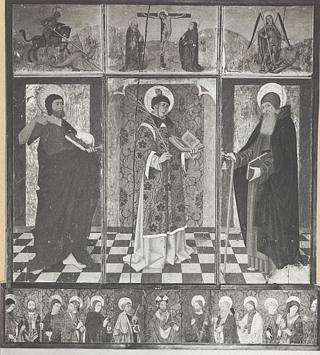 En chef, saint Georges, le Crucifiement et saint Michel. Au centre, saint Jean-Baptiste, saint Etienne et saint Antoine ermite. Prédelle, plusieurs saints et saintes.