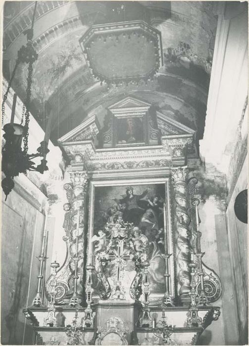 Retable et sa toile. Retable à colonnes torses et fronton triangulaire brisé avec deux toiles : l'Assomtion de la Vierge et le Père Eternel.