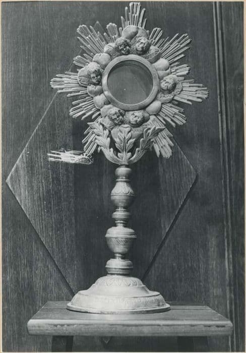 Ostensoir orné d'angelots dans une gloire de nuages et de feuilles stylisées. Pied circulaire décoré de feuilles stylisées. Noeud constitué de deux balustres décorées de motifs géométriques et végétaux. Trois feuilles d'acanthes portent le soleil et la gloire de nuages et angelots entourant la lunule.