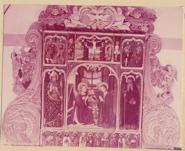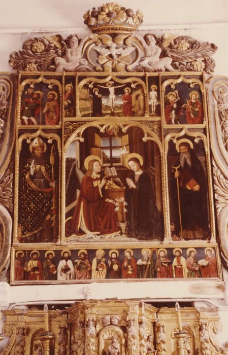 Divisé en trois parties. En haut : à gauche, saint Christophe, saint Jean-Baptiste, saint Jean ; au milieu, le Christ en croix entre les saintes femmes ; à droite, saint Sébastien, saint Michel archange et sainte Catherine. Au centre : saint Louis roi, l'Annonciation et saint Antoine. Prédelle : le Christ entouré des apôtres.