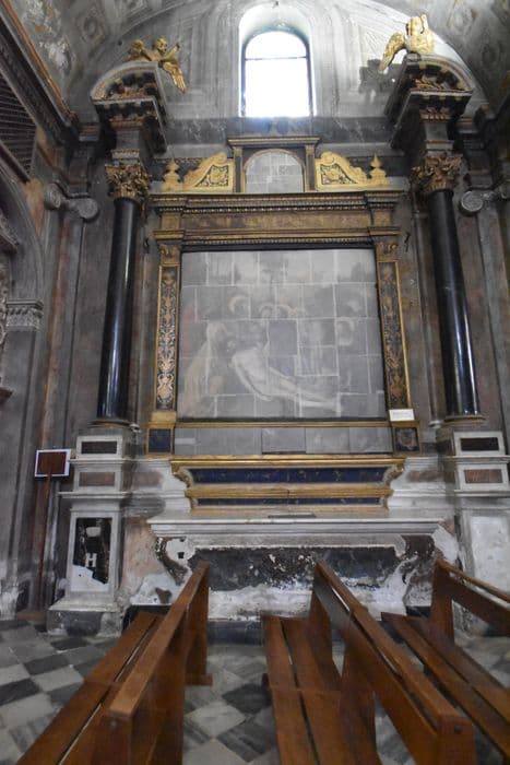 Retable de la chapelle du collatéral Sud : la Descente de croix. Prédelles : cinq sujets.