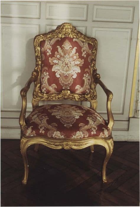 Cinq fauteuils en bois sculpté et doré (peinture bronzinée). Le cadre du dossier est rehaussé par un opulent décor sculpté : feuilles de vigne et fruits en frise, dauphins. Deux fauteuils ont été récemment recouverts de moire blanche, les autres conservant leurs soieries lampassées à gros motifs, dans le style du 18e siècle (fond rouge).