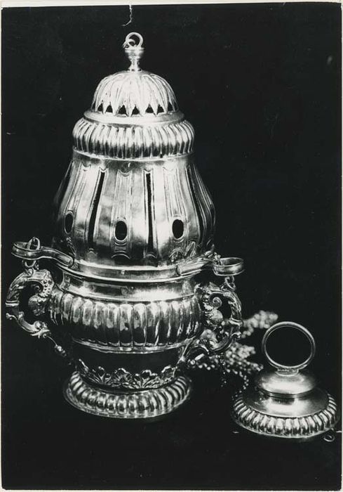 encensoir en forme d'urne cinéraire, la cassolette est ornée de cannelures et d'une frise de feuillages stylisés. Les chaînes y sont fixées à trois anses en forme de volutes en C. Couvercle plus allongé ajouré de fentes dans le sens de la hauteur ou d'oculi (alternativement), même décor de cannelures et au sommet corolle de feuilles.
