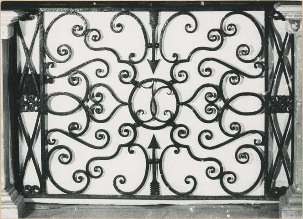 Grille à entrelacs de volutes avec médaillon central circulaire entourant les lettres I. C. entrelacées.