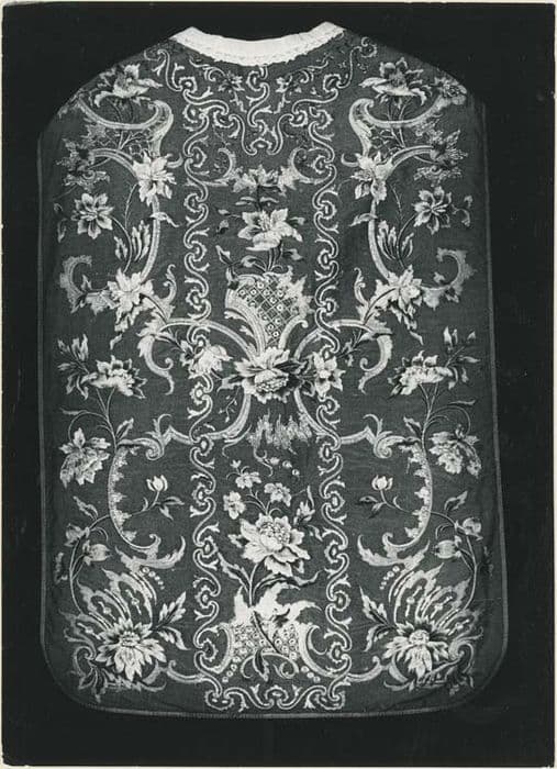 Chasuble (avec étole et manipule). Fils d'or et polychromes brodés sur soie blanche. Arabesques, grands ramages avec grandes fleurs or et polychromes sur fond blanc-ivoire.