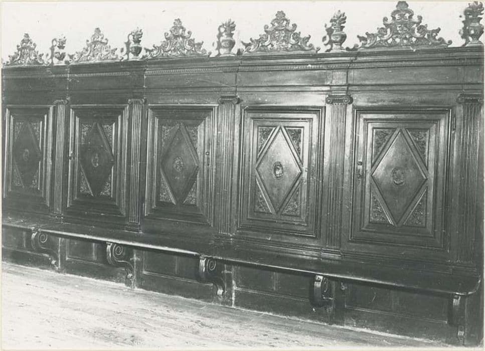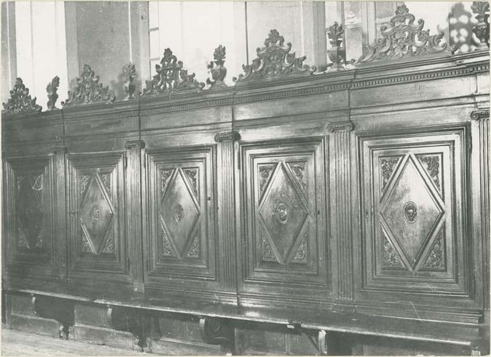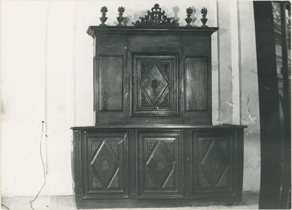 Meubles de sacristie : trois pièces, une grande armoire à deux corps et deux meubles jumeaux avec banquettes. Armoire à deux corps (deux placards superposés), meubles jumeaux plus bas avec banquettes devant les portes de cinq placards. Portes décorées de bossages en relief (losange entouré de quatre triangles composant ensemble un rectangle), les triangles décorés de rinceaux, les losanges de médaillons ovoïdes représentant chacun un élément différent : bouquets, château, église, armes, bateau, buste de saint Ignace, l'un porte une date : 1696 (meuble côté Sud). Corniches surmontées de pots à feu (bords des placards) et de motifs sculptés (frontons sur les portes).