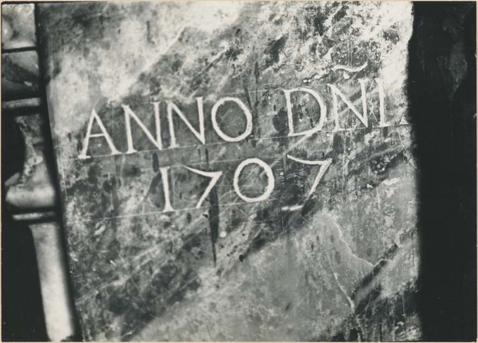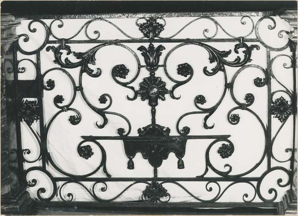 Balustrade à deux volées séparées par une grille fixée par deux paumelles. Balustres de section quadrangulaire, à simple poire. Grille décorée de volutes rehaussées de feuilles d'acanthe et de fleurs, au centre calice avec élévation du saint sacrement.
