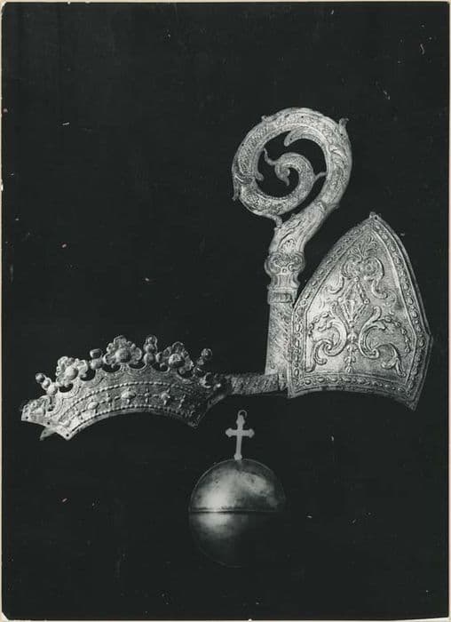 Pièces d'ex-voto (fonctions combinées). Attributs épiscopaux de saint Eloi : mitre décorée de rinceaux et de cabochons, crosse, orbe et deux couronnes.