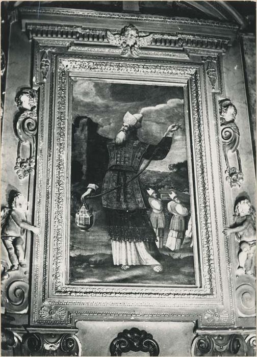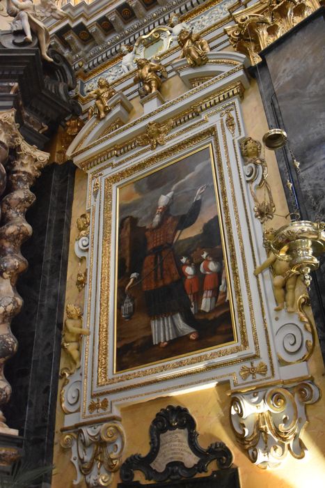 Toile avec son encadrement de stuc peint et doré. Encadrement : frises de feuillages décorant une succession de moulures, des anges flanquent le cadre couronné par un fronton en arc de cercle.