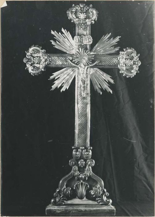Pied constitué par deux volutes encadrant une coquillette. Bras de la croix décorés par un fond en écailles de poissons et terminés par un grand motif en forme de coeur. Rayonnement à la croisée.