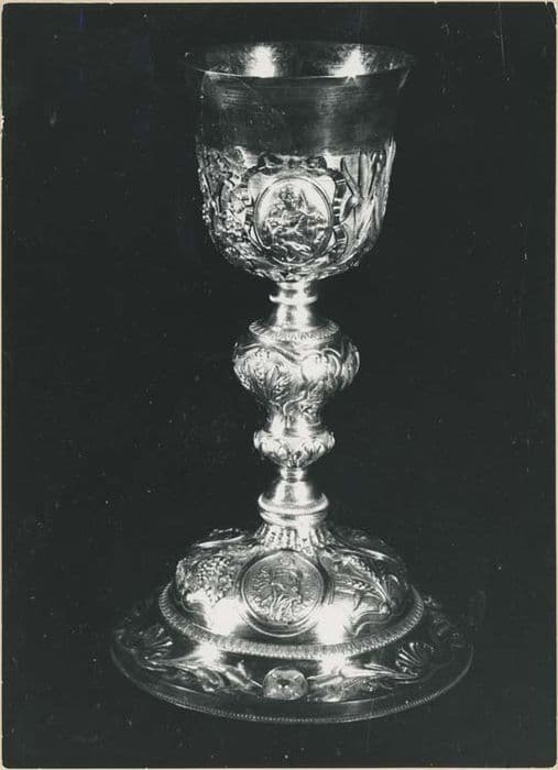 Pied circulaire polylobé avec volutes en frise et symboles eucharistiques. Noeud évasé avec décor semblable, timbale avec trois médaillons (personnages de la Sainte Famille).