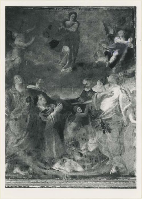 tableau, cadre : la Vierge en gloire entourée de sainte Catherine d'Alexandrie, saint Dominique, saint Thomas d'Aquin et sainte Marie-Madeleine, avec un portrait du donateur