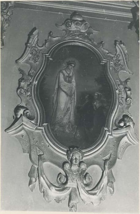Encadrement en gypseries chantourné de style rocaille du 18e siècle. Désignée à tort comme représentant sainte Elisabeth de Hongrie.