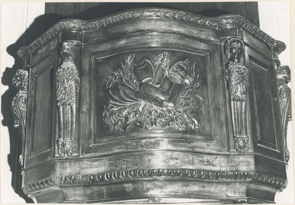 Cuve de section polygonale, le côté médian animé d'une ligne courbe. Des angelots cariatides séparent les panneaux les uns des autres, celui du centre est décoré en relief de motifs symboliques se rapportant à la Prédication. Deux frises (feuilles et oves) ornent le haut et le bas de cette cuve. Abat-voix à lambrequin, portant en son ciel la colombe du saint Esprit rayonnante.