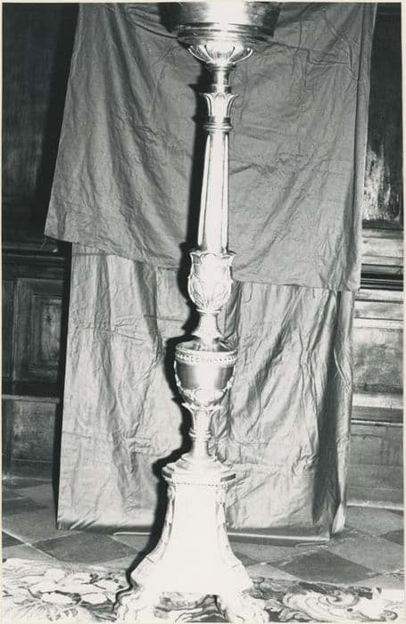 Grand chandelier pour le cierge pascal. Chandelier tripode décoré sur une seule face. Socle pyramidal aux arêtes rehaussées d'une frise de fleurs. Noeud en balustre évasé, la panse décorée d'une guirlande. Fût en balustre allongé avec cannelures et ornementation de feuilles stylisées.