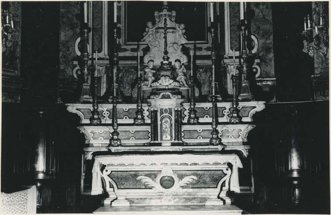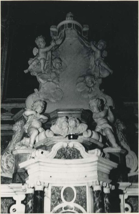 Autel à tombeau surmonté de gradins, avec tabernacle à colonnes et exposition, marbres en partie sculptés. Table d'autel à tombeau décorée d'un médaillon entouré de deux palmes, deux gradins entourant le tabernacle à colonnes. Le tout est décoré de panneaux de marbre inscrusté de rouge avec liseré noir, sur fond blanc. Aux extrémités, têtes d'anges et médaillons sont l'un porte une date. L'exposition consiste en un dais à lambrequin soutenu par des anges.