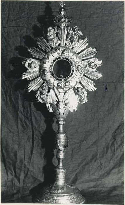 Grand ostensoir. Pied circulaire décoré de trois frises (oves, acanthes et feuilles de laurier en couronne) et de guirlandes sur fond moucheté. Noeud en balustre évasé avec décor de motifs à feuillages et guirlandes. Soleil, hissé sur un bouquet de feuilles d'acanthes présentées en calices avec symboles eucharistiques (grappes de raisins et épis de blé). Les rayons du soleil sont ornés d'angelots figurant sur des gloires de nuages, une petite couronne tenue par deux anges couronne ce soleil.