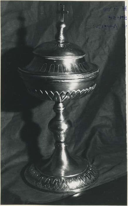 Pied circulaire décoré d'une frise de feuillages stylisés. Noeud en balustre, coupe et couvercle décorés des mêmes frises de feuilles (en relief plus important sur la coupe).