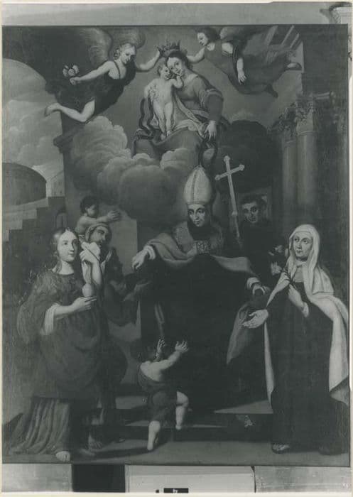 POP | Plateforme ouverte du patrimoinetableau : le Couronnement de la Vierge et saint Thomas de Villeneuve distribuant des aumônes entre sainte Marie-Madeleine, sainte Thérèse d'Avila, saints Laurent et Justinien