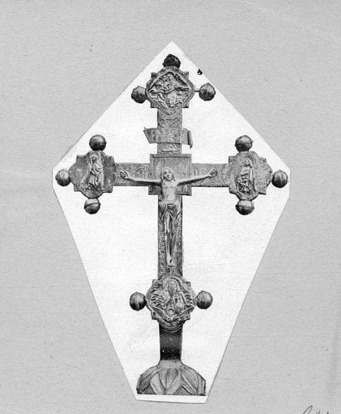 Croix processionnelle en argent ornée de boules avec motifs en relief sur les deux faces représentant des feuillages et des rinceaux. Noeud décoré de six médaillons en forme de losange et figurant les scènes de la Passion, gravées au trait.