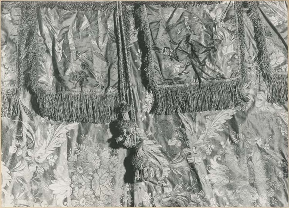Ciel de baldaquin avec hampes. Broché de soie or, fond rouge.