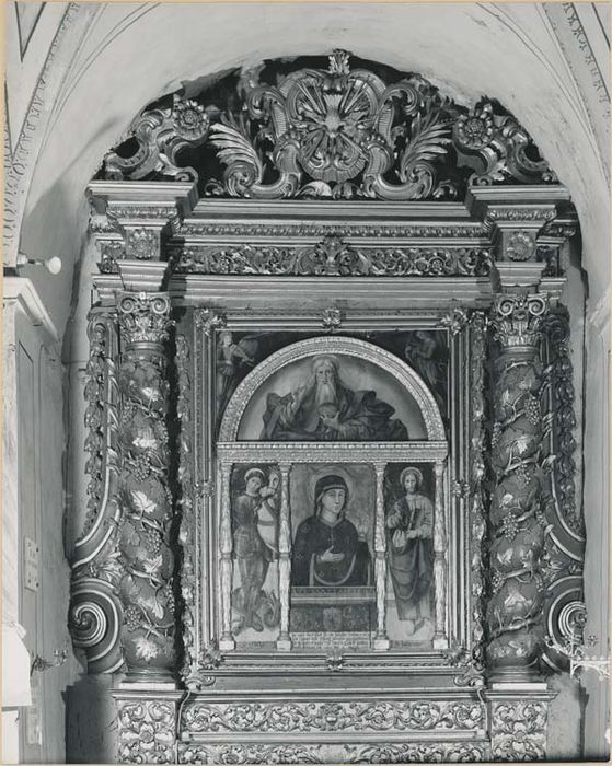 Retable auquel manque le panneau central qui a été remplacé par une toile représentant la Vierge, et la prédelle. En chef, Dieu le Père. Au-dessous, à gauche, saint Georges, et à droite, saint Barhtélémy.