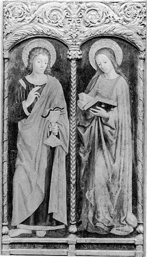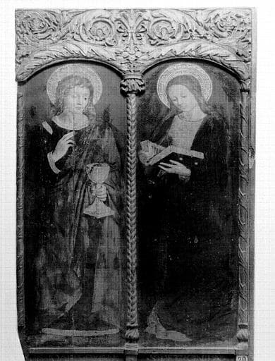 Deux panneaux peints provenant d'un retable. Sous des arcatures de bois doré. Les nimbes, ornements et attributs sont saillants et gauffrés.