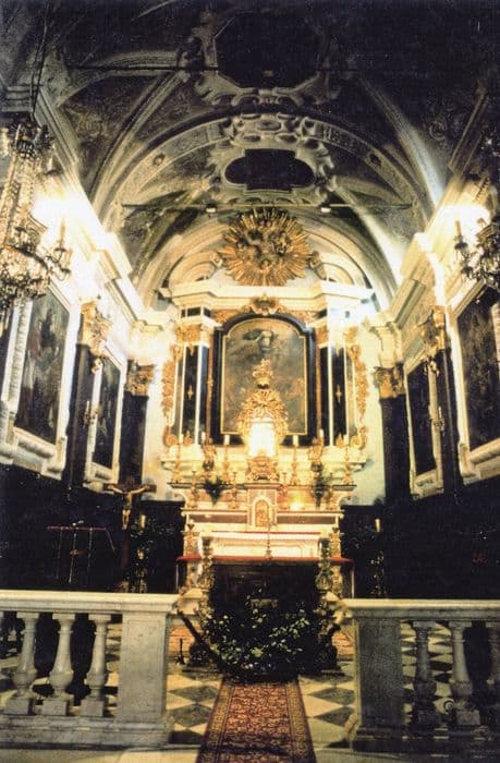 Des pilastres latéraux à ressauts et chapiteaux composites soutiennent un entablement très étroit, fronton brisé à volutes avec dans le centre le Père Eternel représenté bénissant et entouré d'angelots et d'une gloire rayonnante. Le tout en relief.