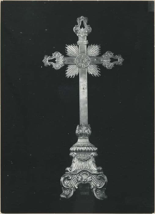 Croix d'autel et chandeliers (une croix d'autel et trois chandeliers, plus deux chandeliers tronqués au-dessus du socle). Pièces tripodes en totalité. Socles : profils triangulaire, volutes pour pieds et contours, fond décoré par gauffrages et cannelures et coquillette. Noeud : pour chandeliers intégralement conservés seulement, lyriforme avec décor identique. Tige : colonne cannelée, porte-bobèche évasé et décoré intérieurement de cannelures. Croix : extrémités lyriformes, rayonnement de type classique autour du Christ disparu.