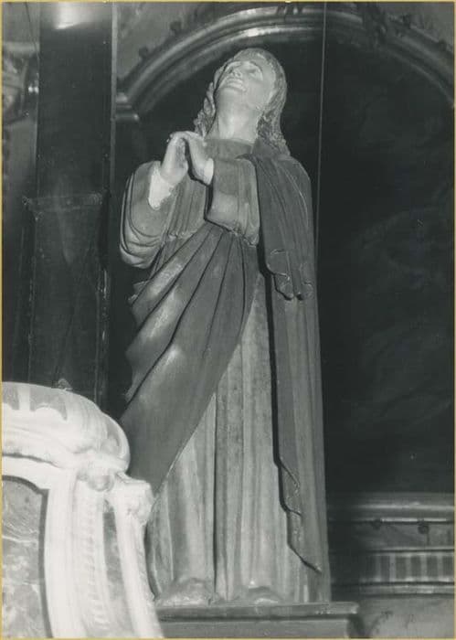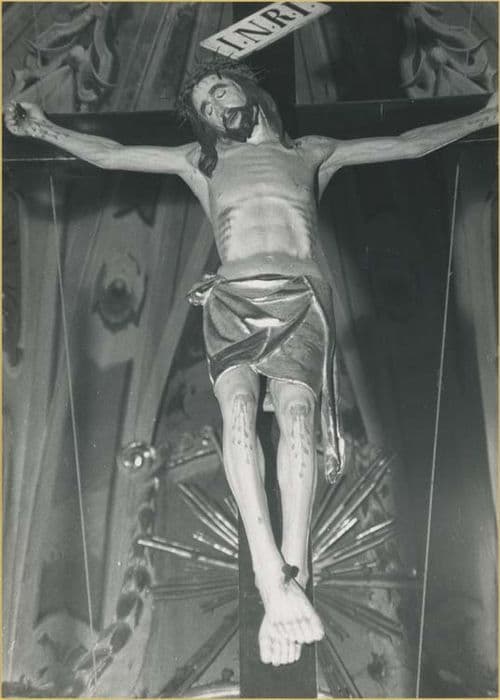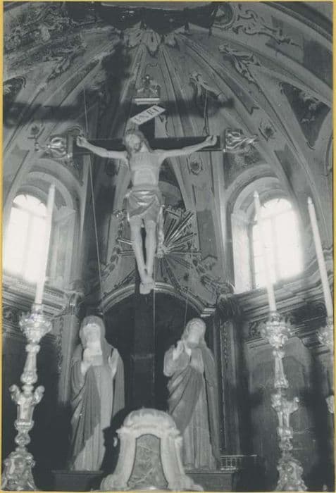 158 h ; 120 la (Dimensions du Christ) ; Dimensions de la Vierge et de saint Jean : h = 118, la = 40
