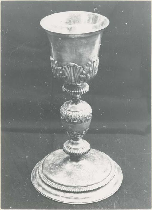 Pied circulaire décoré d'une frise de godrons. Le monogramme du Christ est ciselé dans un médaillon décoré à la manière d'un blason. Le noeud ou balustre s'orne de deux frises de godrons et deux frises de feuilles d'acanthes. La coupe possède une gaine à sa base rehaussée de coquillettes en relief.
