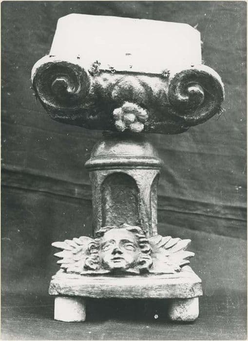 Le pied cylindrique, décoré de nichettes, repose sur un socle horizontal tétrapode. Le pupitre est orné extérieurement de deux têtes d'angelots sculptées.