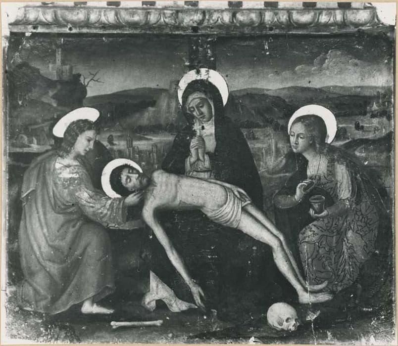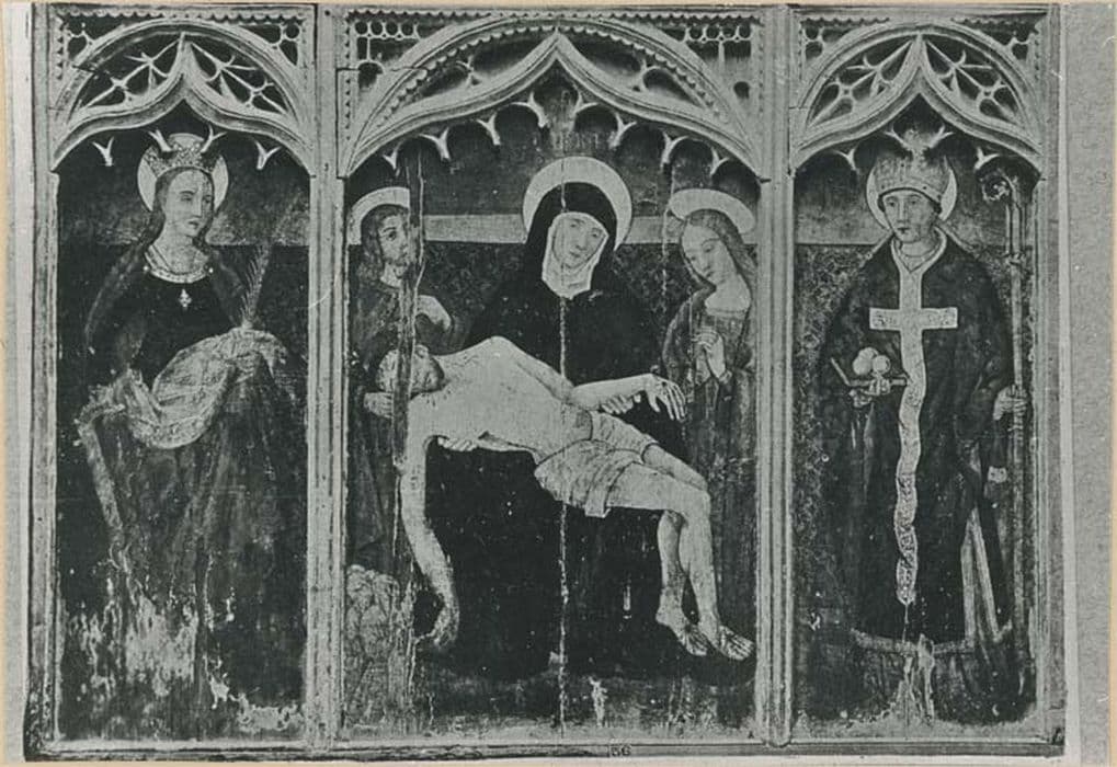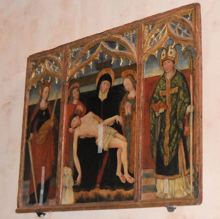 retable, 3 tableaux : Vierge de Pitié, entre saint Jean et sainte Madeleine, sainte Catherine et saint Nicolas