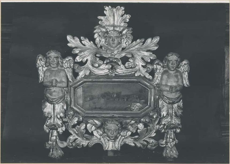 Coffret parallélépipèdique présentant sur la face principale un décor qui compose l'encadrement de la baie vitrée. L'encadrement se compose de deux angelots cariatides entés sur feuilles d'acanthes pour les côtés verticaux. Pour les côtés horizontaux, feuilles d'acanthes et têtes d'angelots.