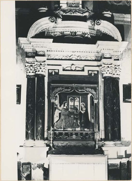 Retable formé d'un seul panneau et d'une prédelle, au centre duquel est peint une fenêtre fermée, à deux battants, avec un arc plein-cintre. A gauche de la fenêtre, l'ange Gabriel un livre à la main. A droite, la Vierge, à genoux, les mains croisées sur la poitrine. La fenêtre donne, à gauche, sur un paysage, qui représente la mer où vogue un bateau ; à droite, un livre posé sur un lutrin et surmonté d'une colombe. A cheval sur les deux battants de la fenêtre, l'inscription. Prédelle : de gauche à droite, un arbre, un abbé mitré, sans doute saint Grat, évêque de Châlon, à qui l'autel est dédié, un religieux martyr, le Christ sortant du tombeau entre la Vierge et saint Jean, un religieux martyr, sainte Catherine d'Alexandrie, un arbre. Auréoles dorées sur le panneau, blanches sur la prédelle. Cadre formé de deux pilastres que surmontent un arc surbaissé décoré de deux palmes.