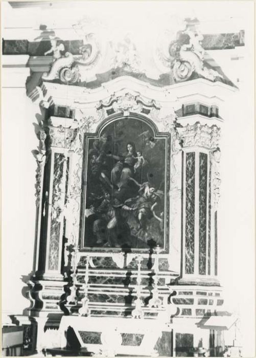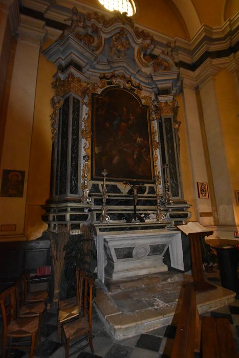 Autel, retable avec sa toile. Gypseries et stucs polychromes et dorés. Autel à tombeau surmonté de trois gradins et d'un grand retable monumental à pilastres corinthiens placés symétriquement l'un à l'autre, mais de biais par rapport au mur. L'entablement curviligne est surmonté d'une corniche à multiples ressauts et d'un fronton également curviligne monté sur deux volutes flanquées d'angelots. Les éléments architectoniques sont dorés sur fond de faux-marbres gris et noir. Une décoration de ramages, volutes et coquilles dorées agrémente le cadre du tableau central, cintré, ainsi que le cartouche central du fronton.