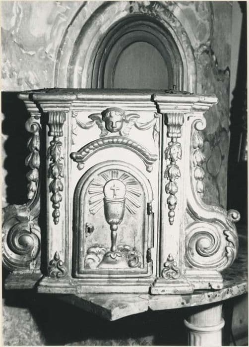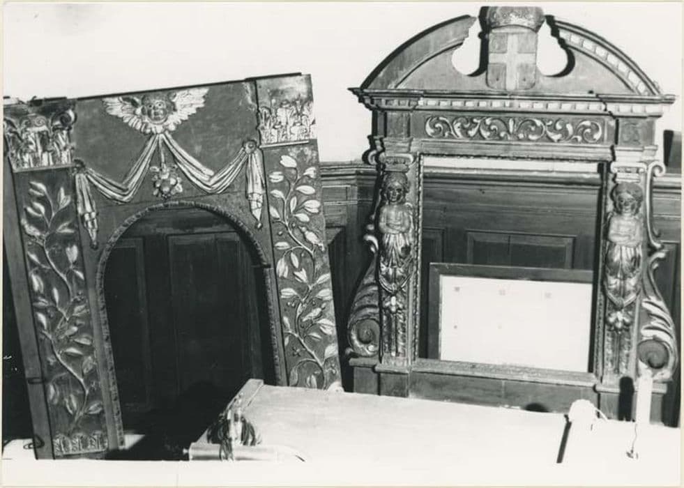 Eléments d'un retable d'autel : quatre colonnes, deux encadrements pour peintures, un tabernacle. Rameaux d'olivier et oiseaux, rehauts sur fond vert. Petit encadrement daté de 1668. Les deux encadrements cintrés comportent des pilastres à chapiteaux composites rehaussés de rameaux d'olivier. L'encadrement du médaillon frontal est surmonté d'un fronton curviligne brisé (blason), les supports décorés de deux anges cariatides flanqués de volutes. Deux paires de colonnes corinthiennes sont décorées de rameaux d'oliviers, la base décorée d'angelots et de grappes de fruits. La face princiapel du tabernacle s'orne d'un décor sculpté : porte avec calice et saint sacrement rayonnant, surmontée d'une tête d'angelot en relief, pilastres ornés de guirlandes ainsi que les deux volutes latérales.